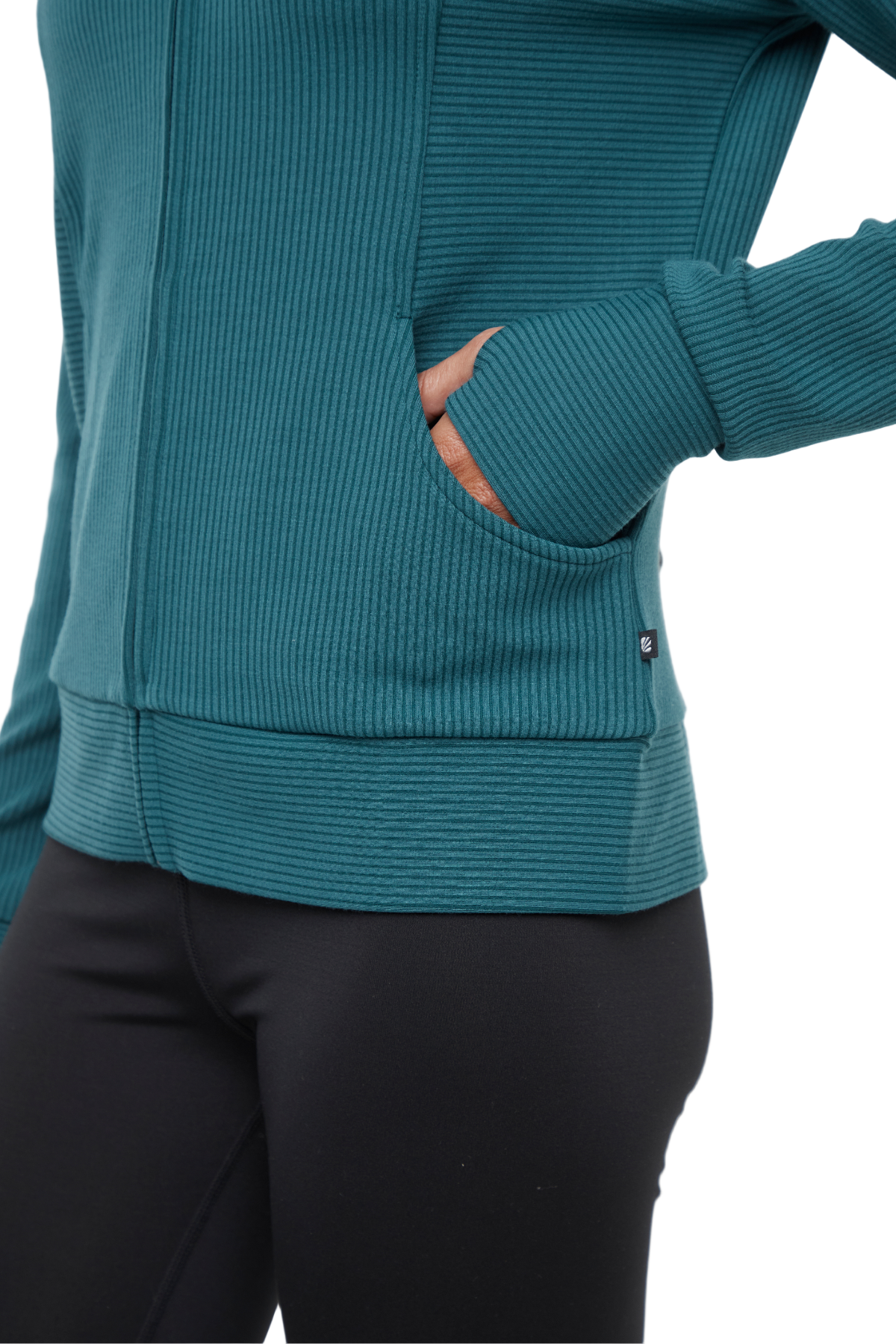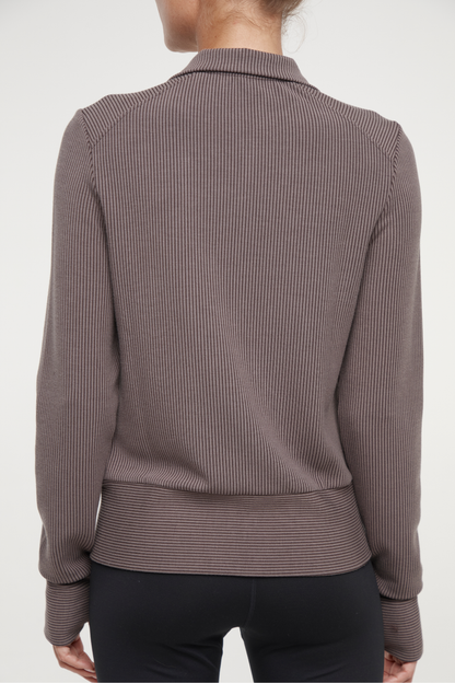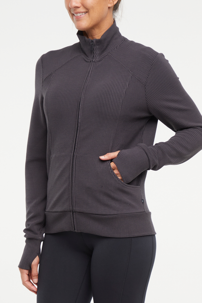A relaxed fit cut from soft rib knit, this mockneck jacket features long sleeves with thumbhole cuffs, handy side pockets, and a full-length front zipper for easy on and off.