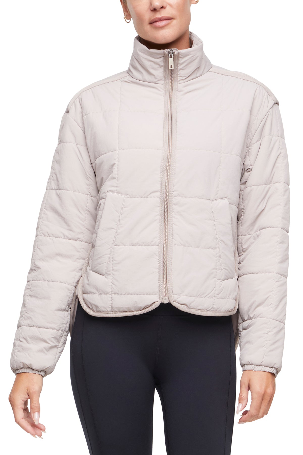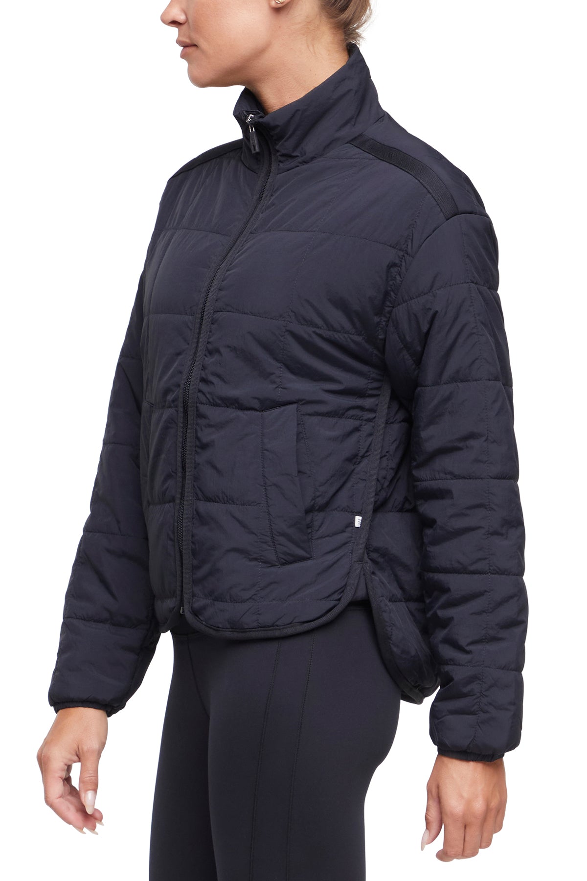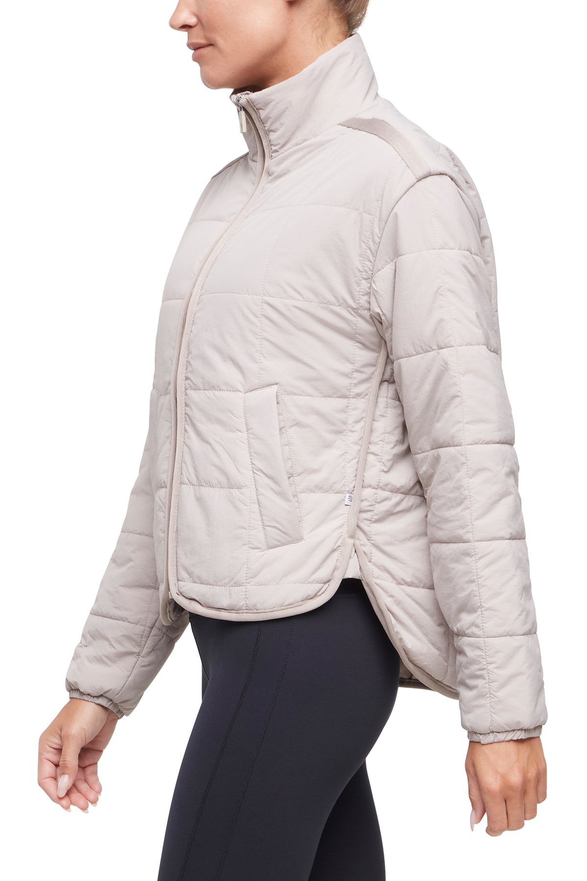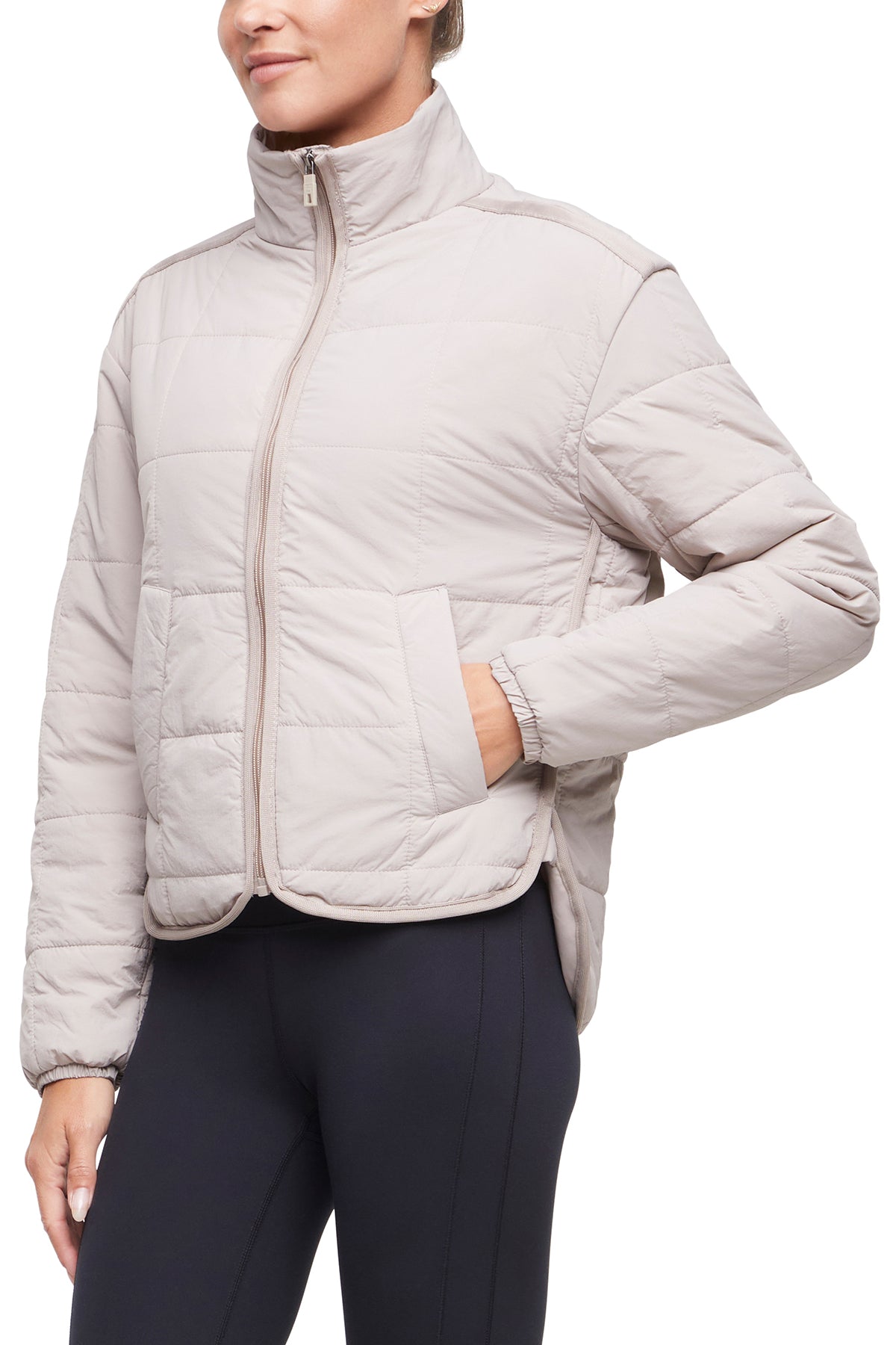 This lightweight quilted puffer features a mockneck silhouette with a full-length front zipper, long sleeves with stretchy cuffs, and side pockets to hold essentials or keep your hands warm.