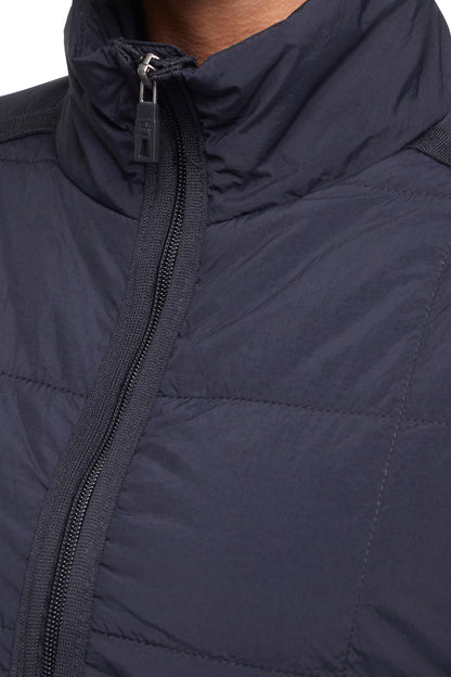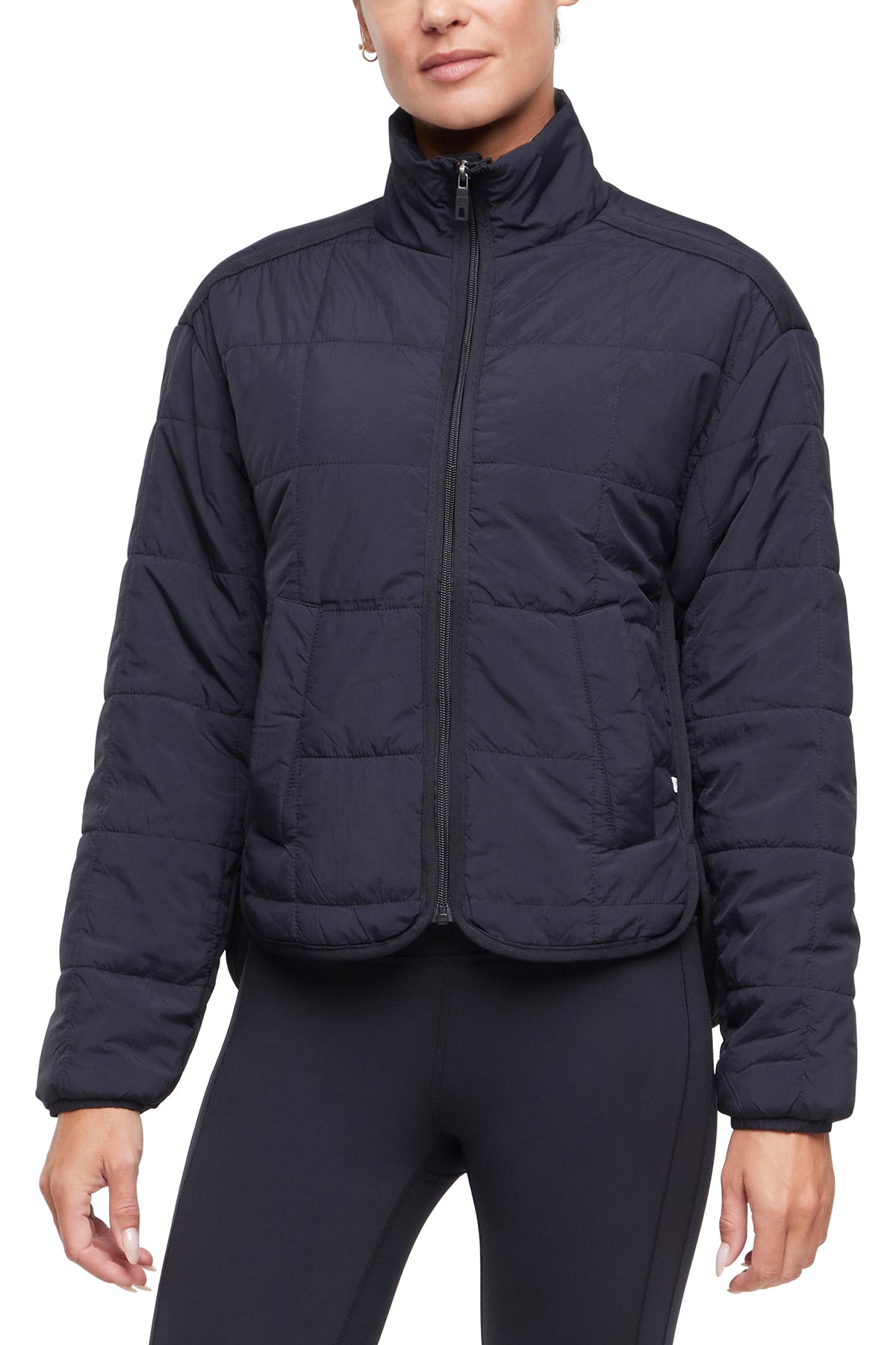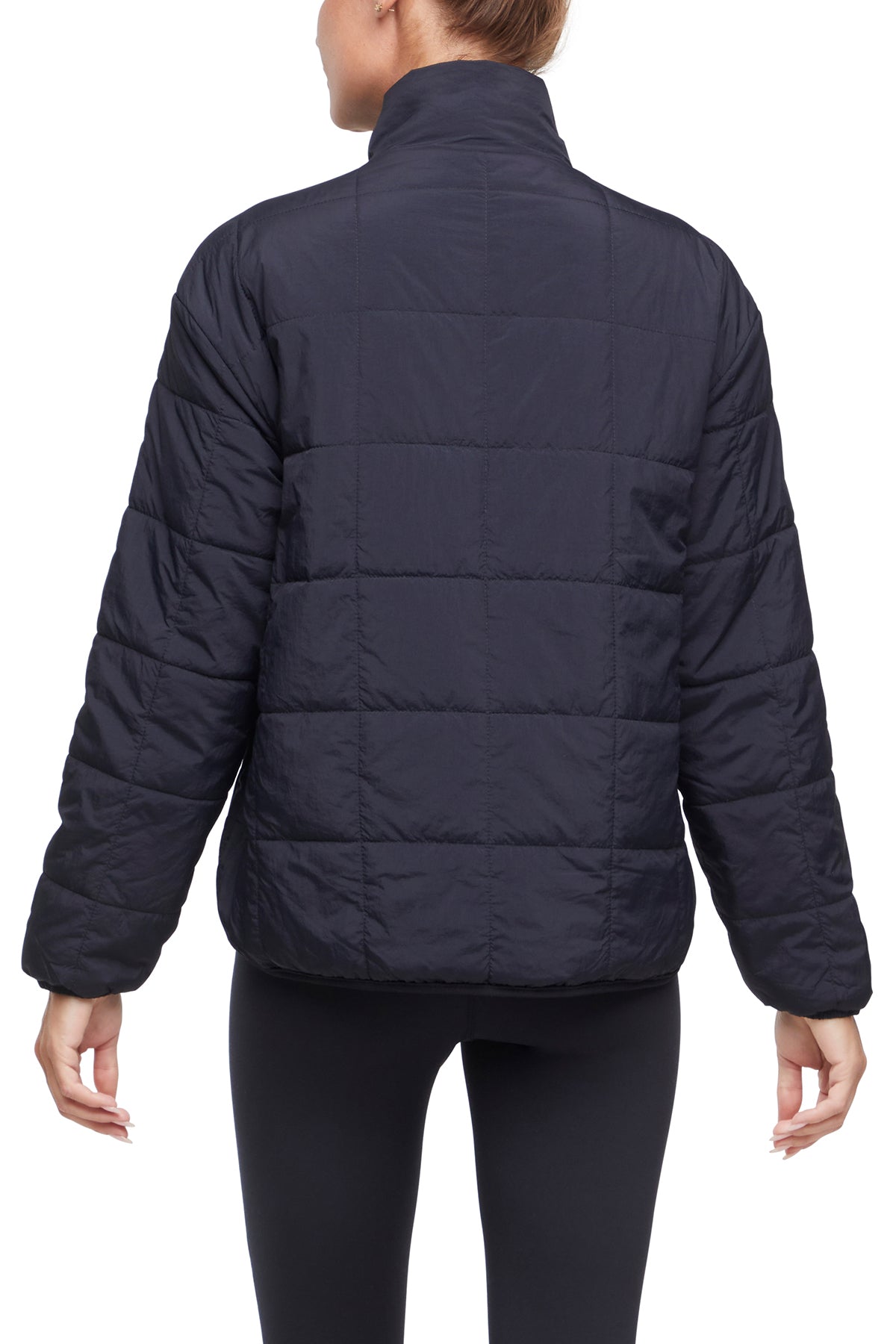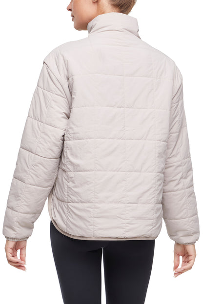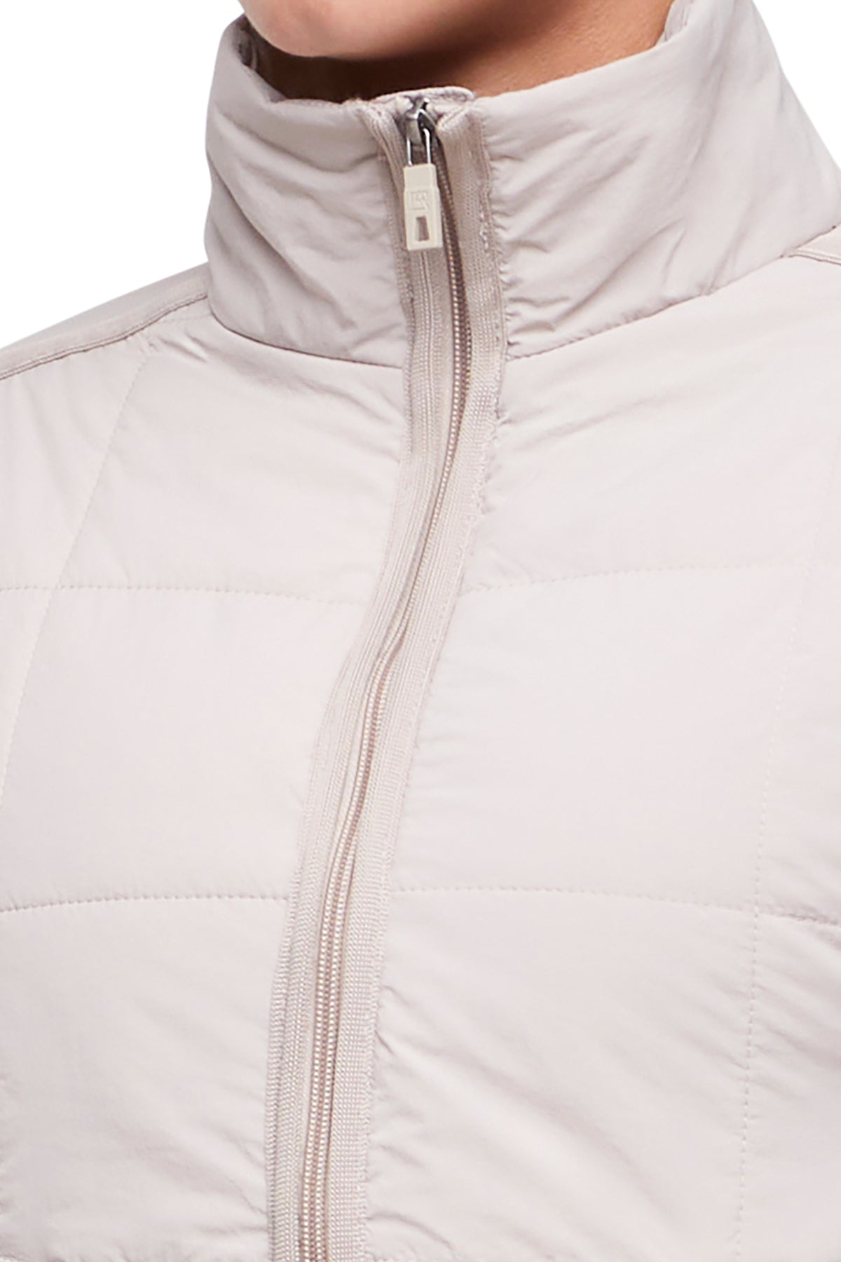 This lightweight quilted puffer features a mockneck silhouette with a full-length front zipper, long sleeves with stretchy cuffs, and side pockets to hold essentials or keep your hands warm.