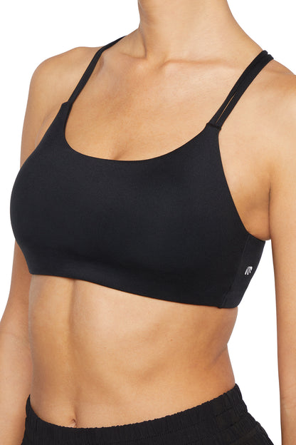 You can find this soft, sweat-wicking sports bra at the intersection of style and comfort – it features a flattering scoop neckline, a cut-out racerback silhouette, and multi-strap styling at the shoulders and bustband.