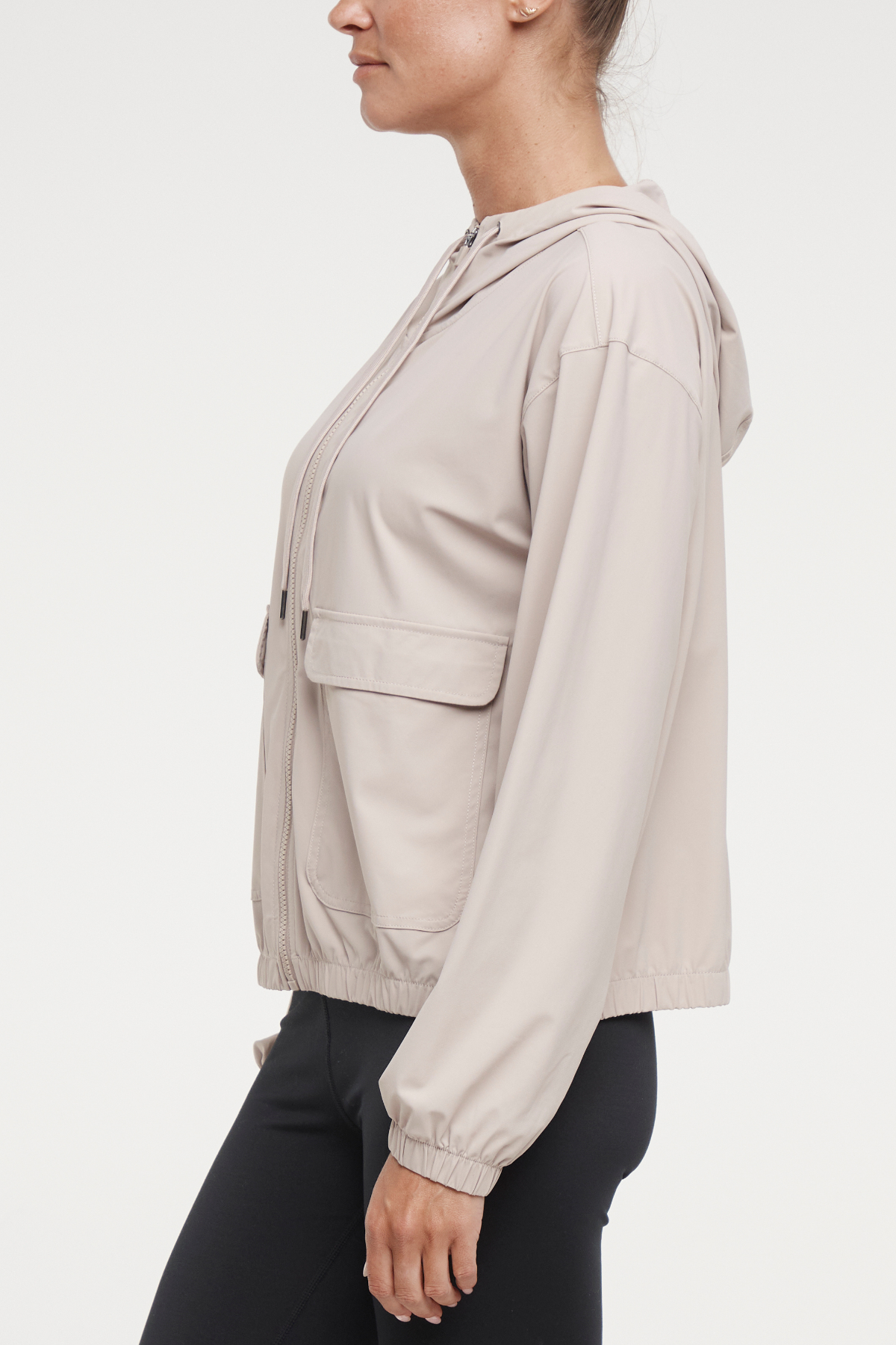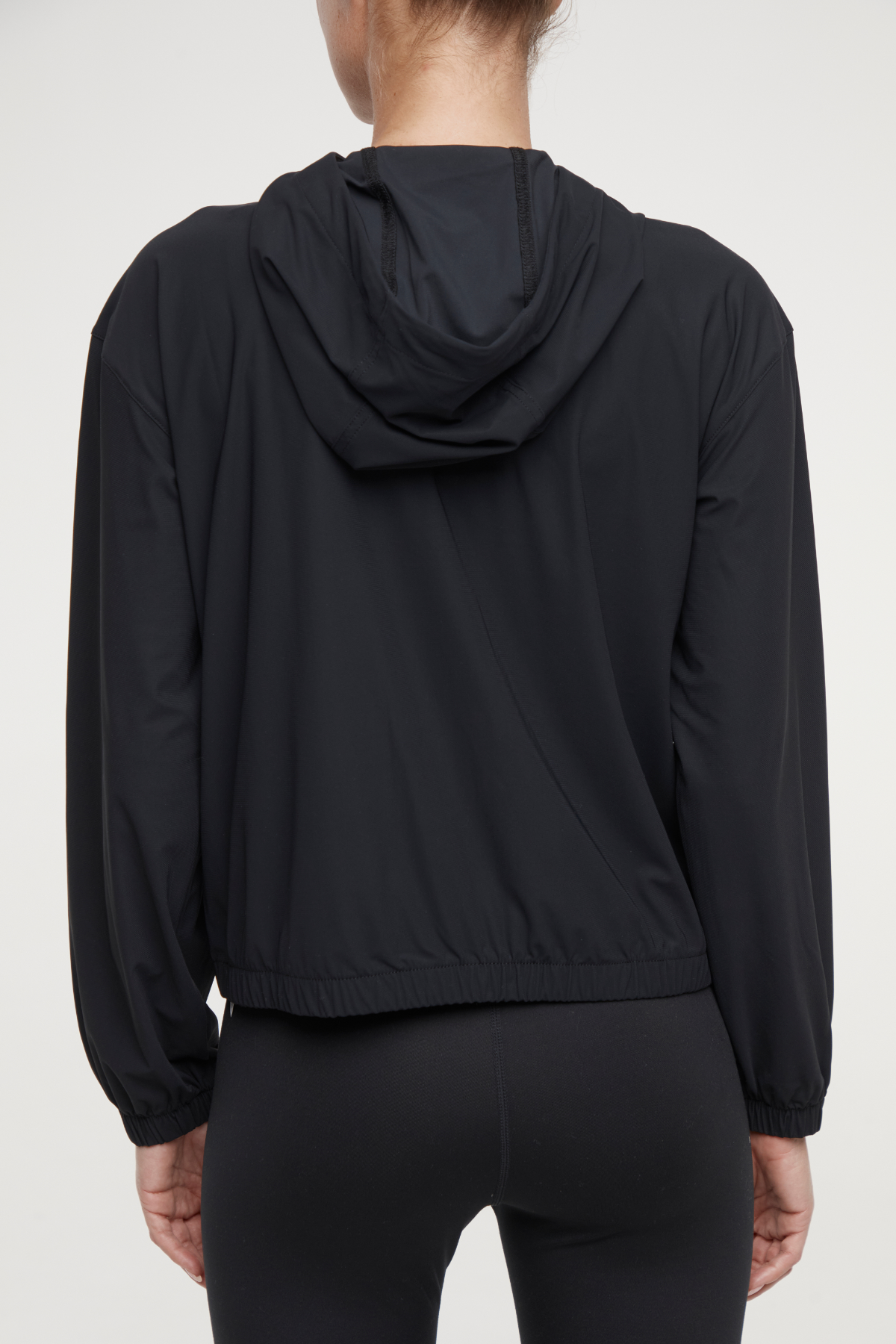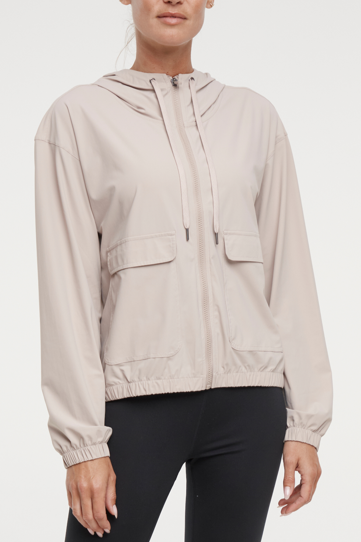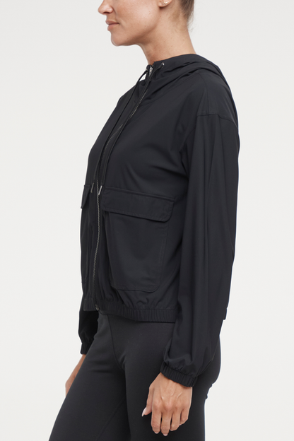 Lightweight and versatile, this jacket features a full zip front, adjustable drawstring hood, elastic cuffs and hem, and flap pockets for easy storage—perfect for layering on breezy days or outdoor workouts.