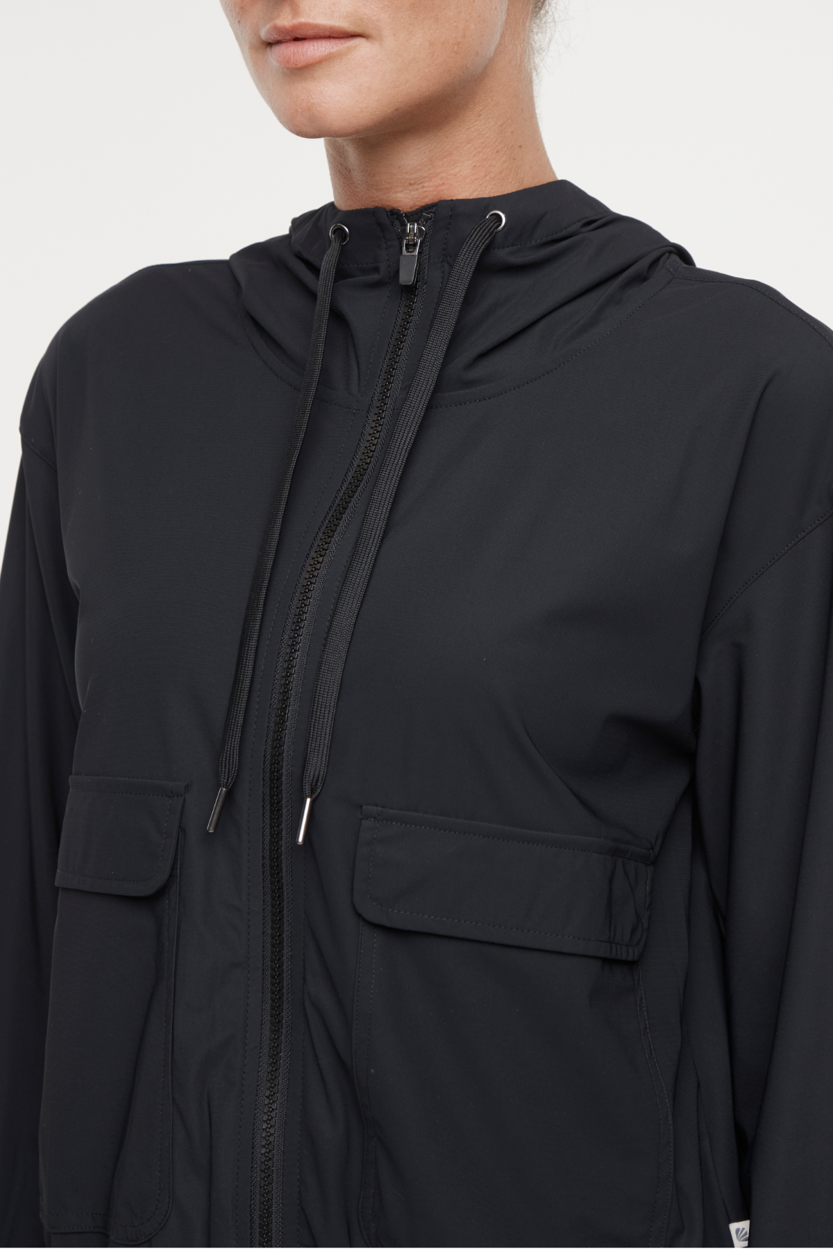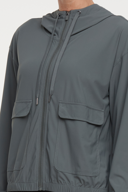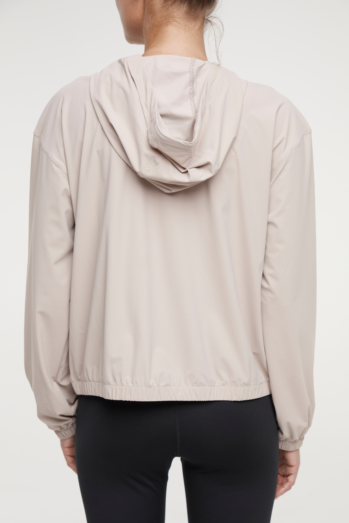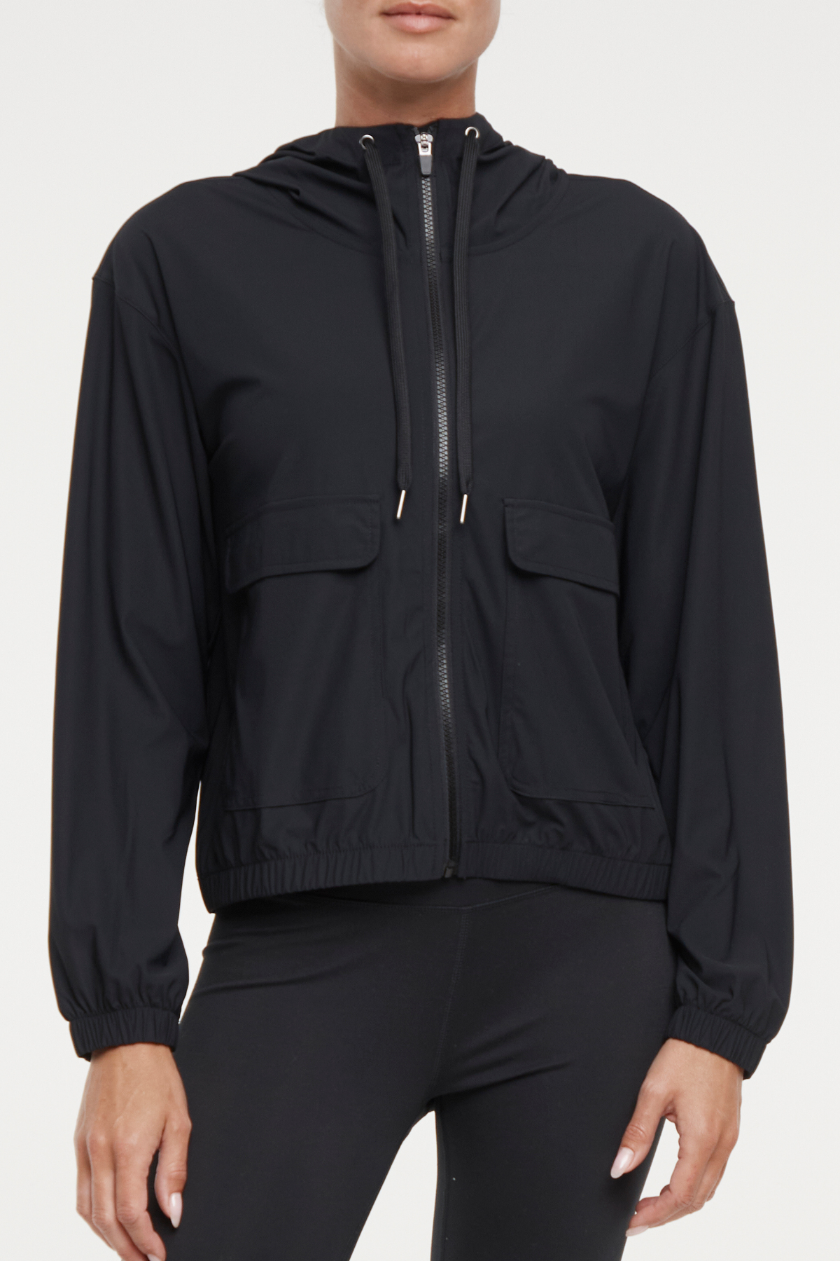 Lightweight and versatile, this jacket features a full zip front, adjustable drawstring hood, elastic cuffs and hem, and flap pockets for easy storage—perfect for layering on breezy days or outdoor workouts.