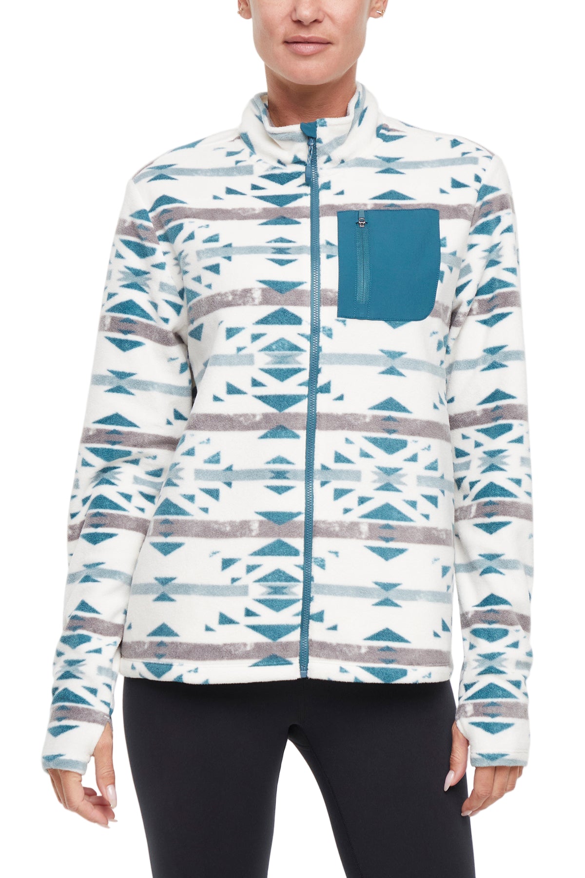 This mockneck jacket in soft fleece features a full-length front zipper for easy on and off, thumbholes to help hold in warmth, and plenty of pocket space to keep you hands-free.