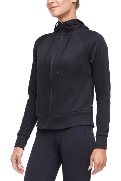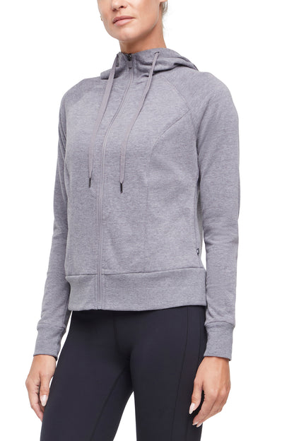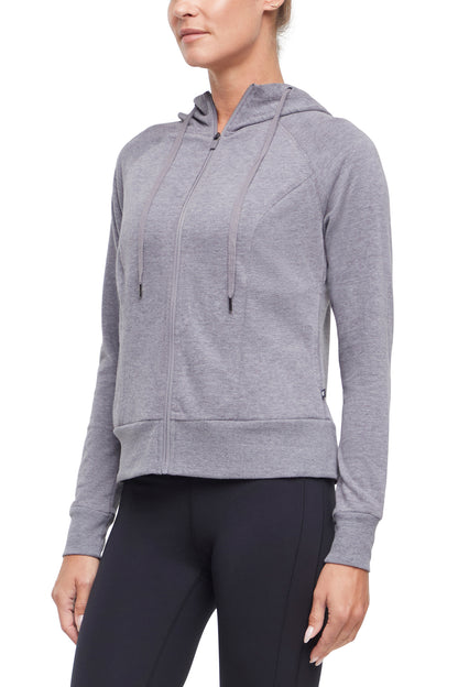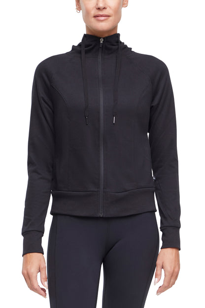 Cozy up in style with this Lyla full zip-up hoodie! Crafted in a soft French knit terry, it features a sleek silhouette, drawstring hood, and ribbed hem for a snug fit. Whether you're warming up or winding down, this piece adds a fresh, feminine touch to your activewear lineup.