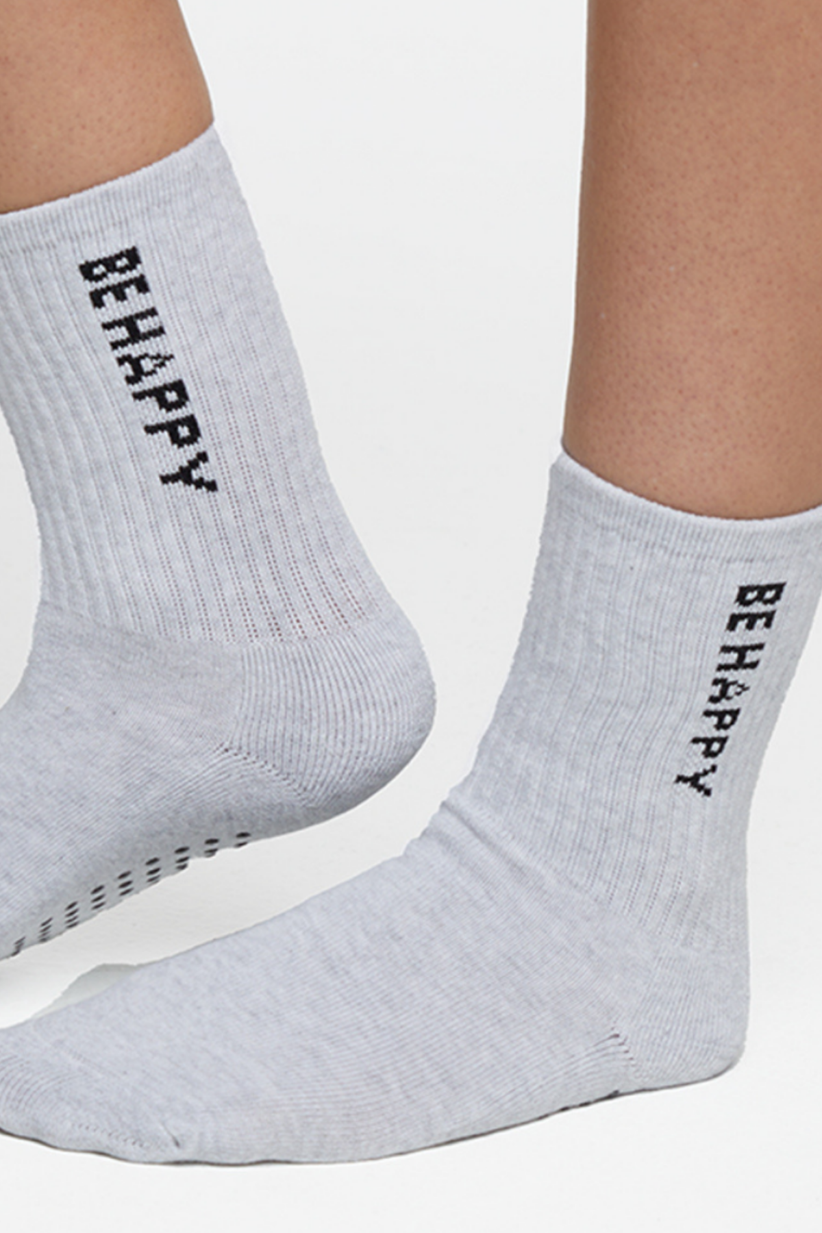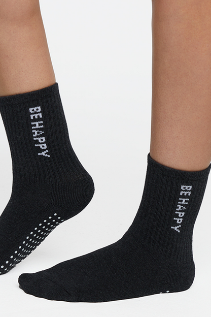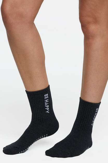 Step into positivity! These soft pairs of heather grey and black crew socks bring cozy comfort and a boost of motivation with their bold “BE HAPPY” message. Ribbed texture and grippy soles make them perfect for lounging or light movement.