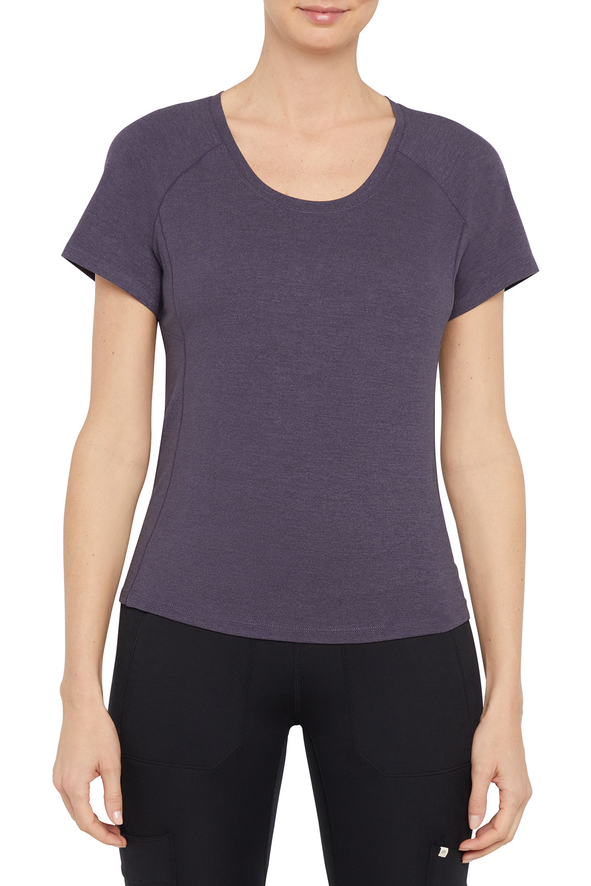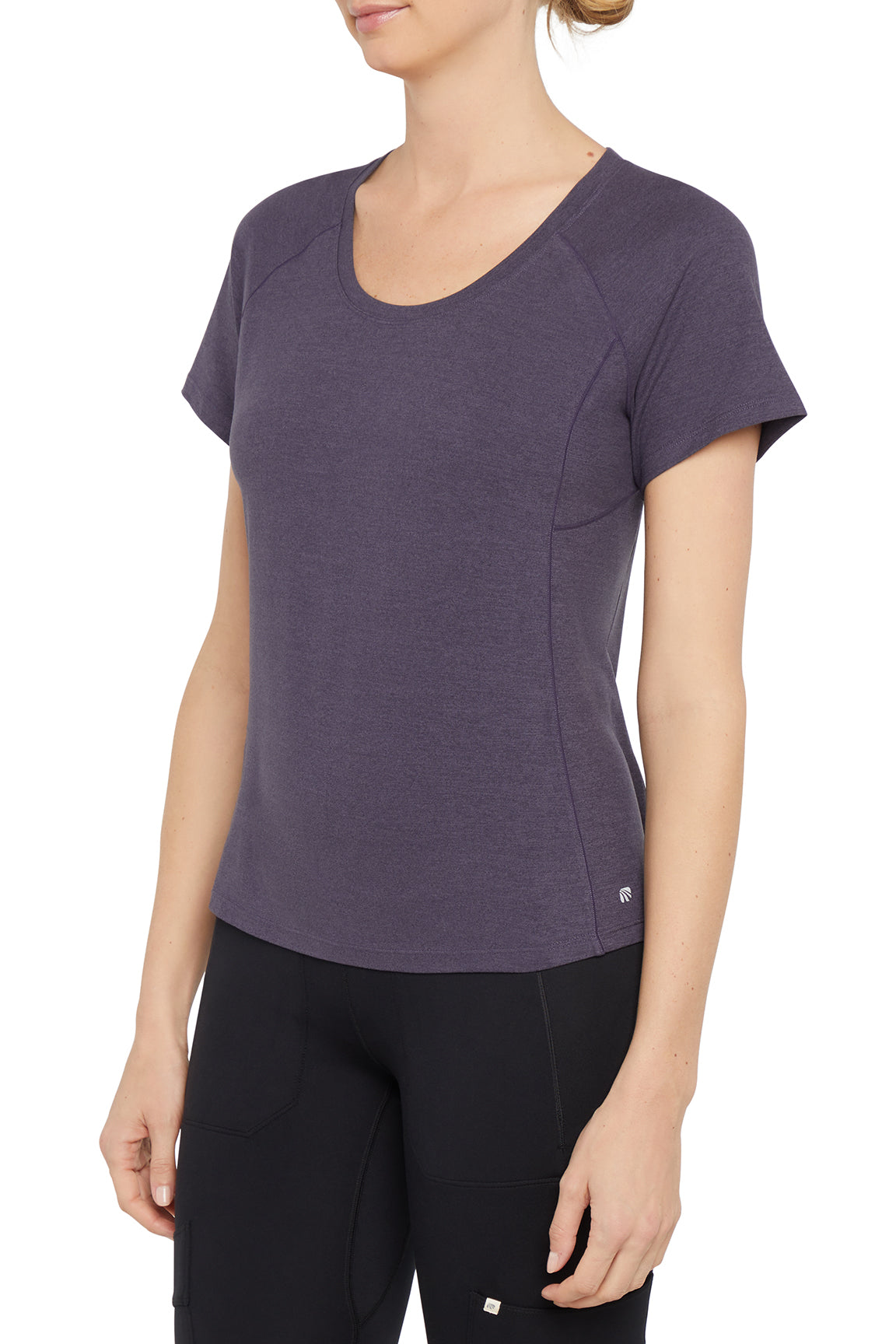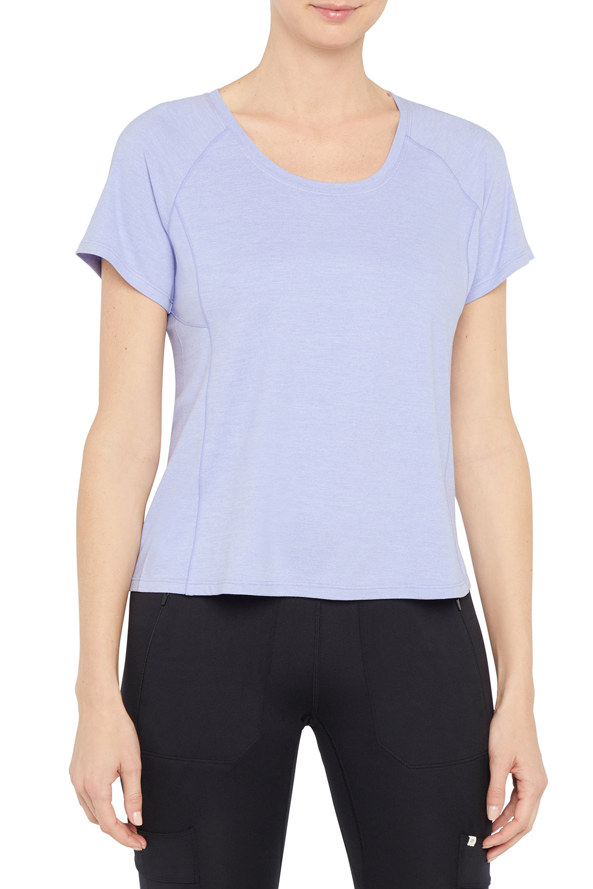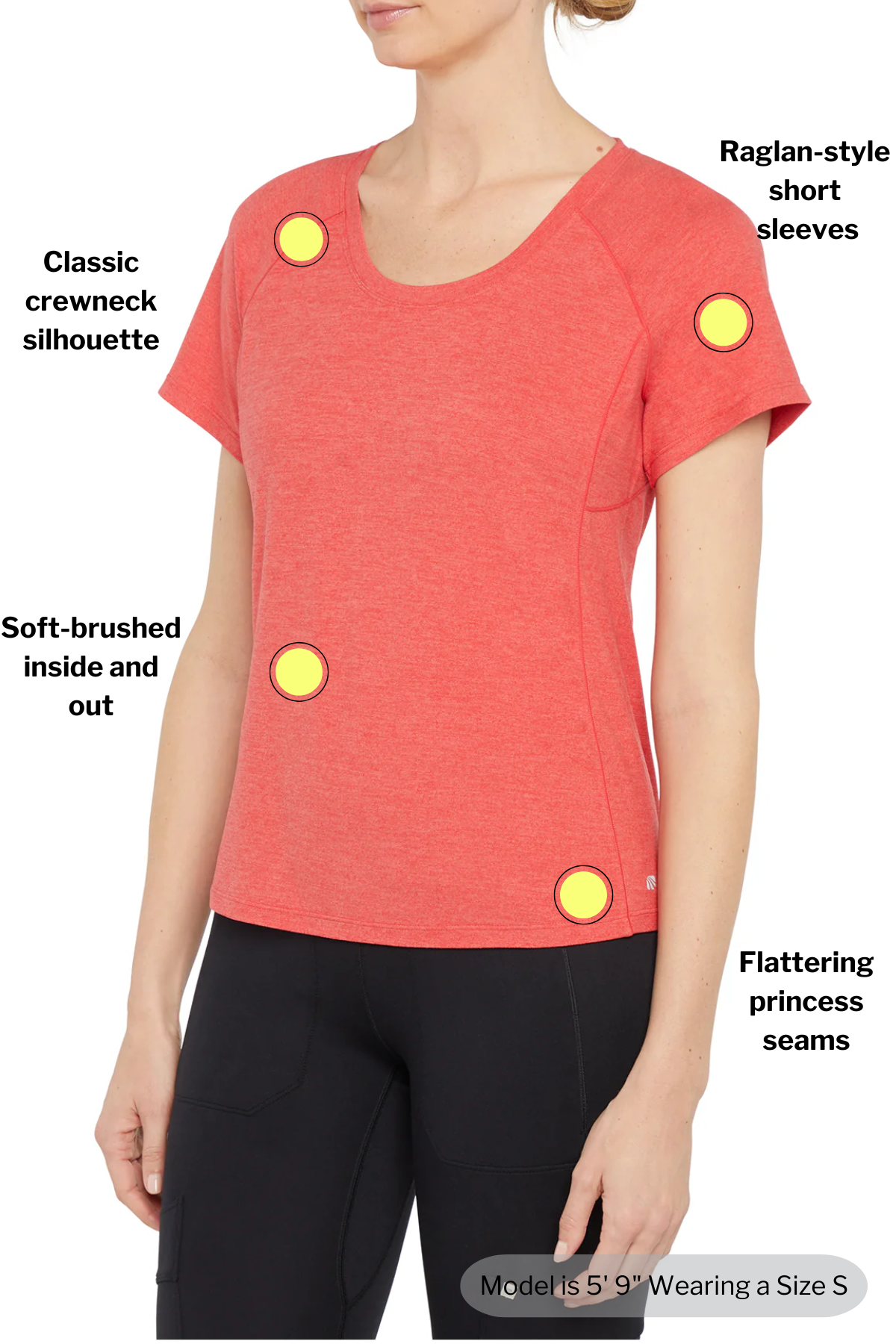 Crafted from our LuxTouch fabric, soft-brushed inside and out for ultimate comfort, this crewneck top features a paneled design with raglan-style short sleeves and princess seams.