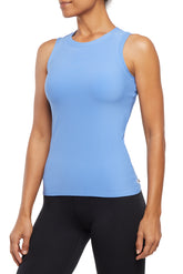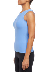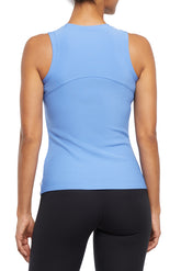 An everyday essential that goes from studio to street to sleek date night ensemble, this versatile rib knit tank top features a fitted silhouette, a classic crew neckline, banded armholes, and a curved back yoke.