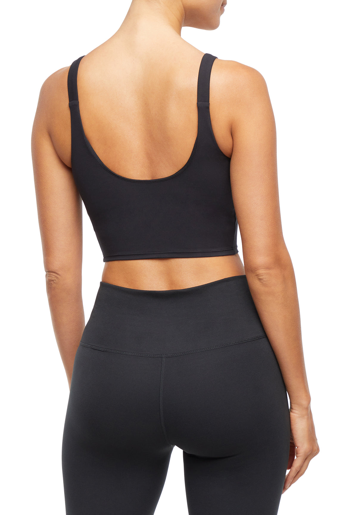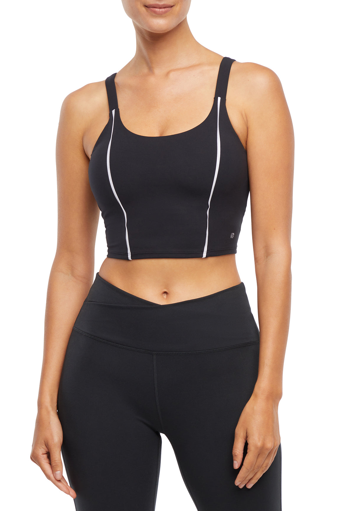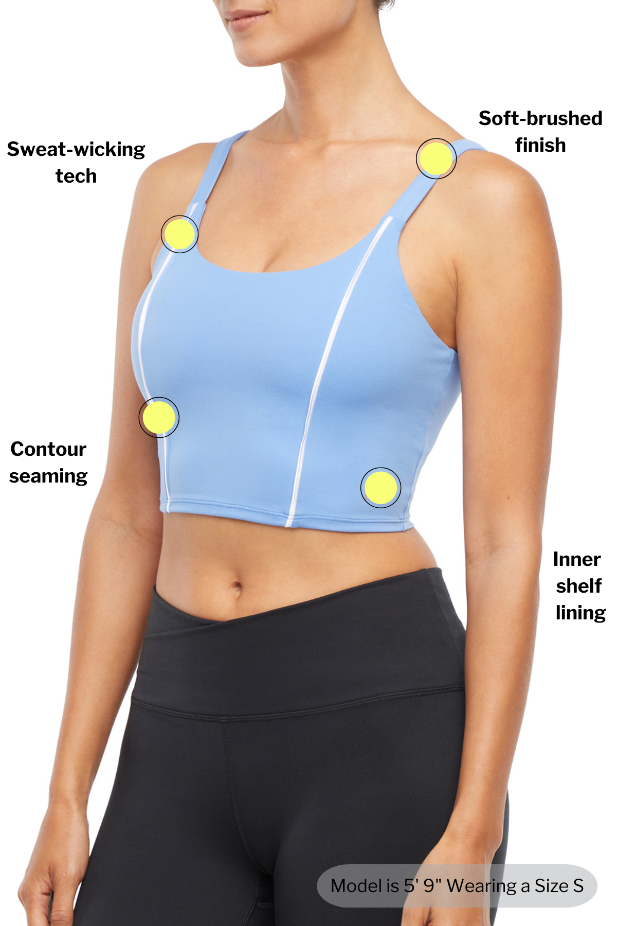 As flattering as it is functional, this medium-impact long bra is cut from soft-brushed, sweat-wicking fabric, with an inner shelf for extra support, a low U-back, and contour seaming with piped trim accenting.