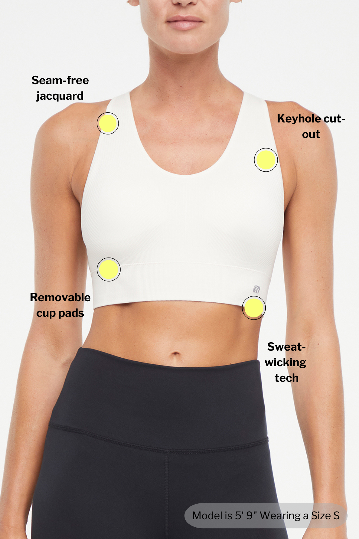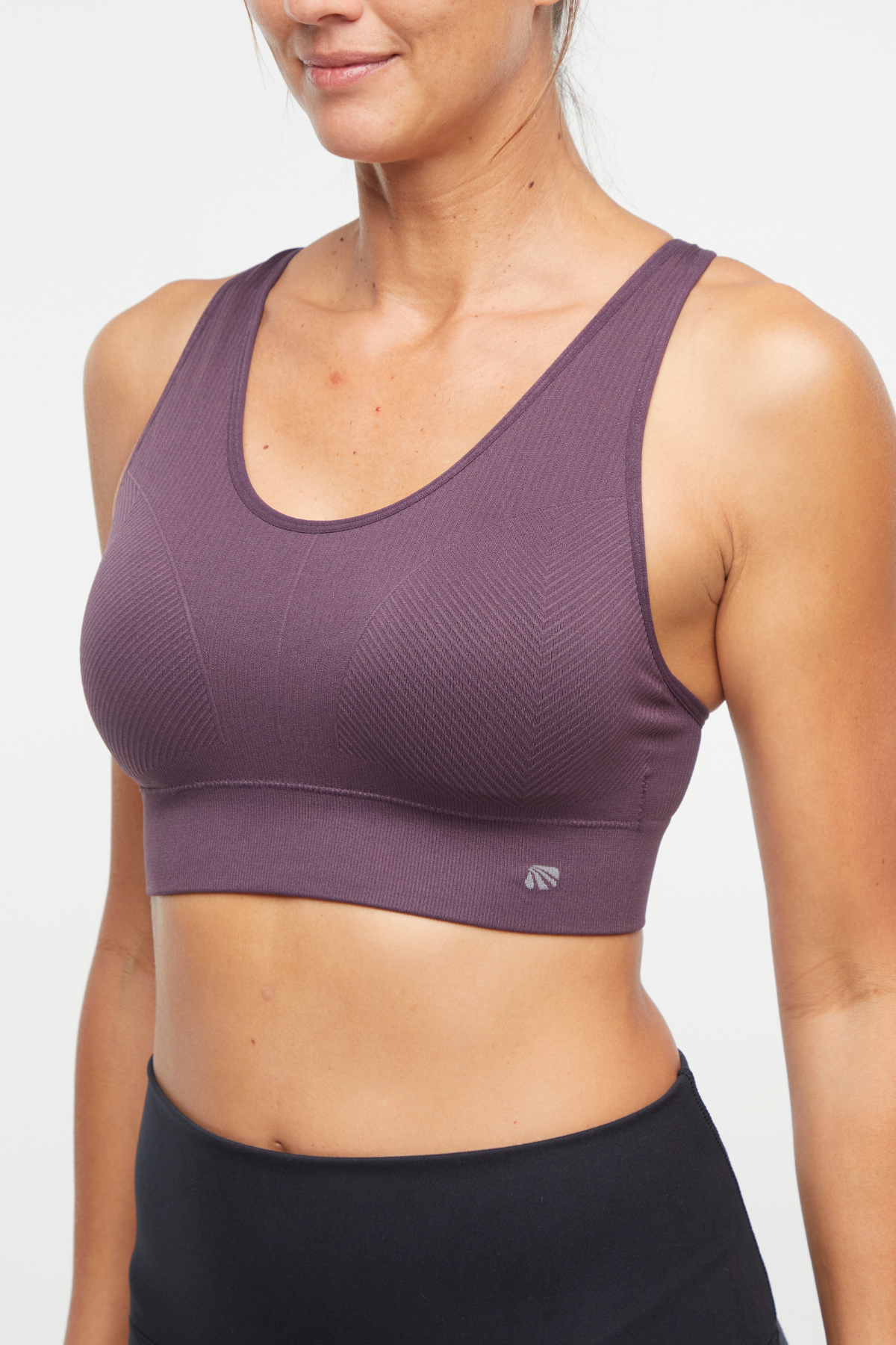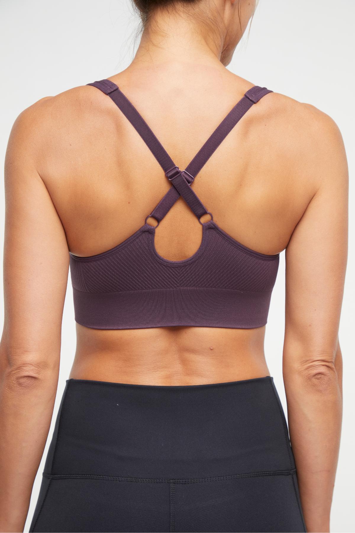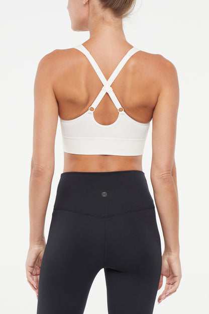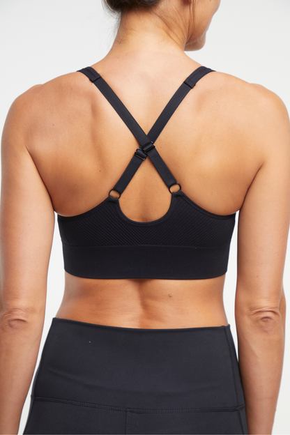 Seam-free and sweat-wicking for your comfort, this jacquard knit sports bra features ribbed panels, curved accenting at the bust, and adjustable shoulder straps that crisscross over the back.