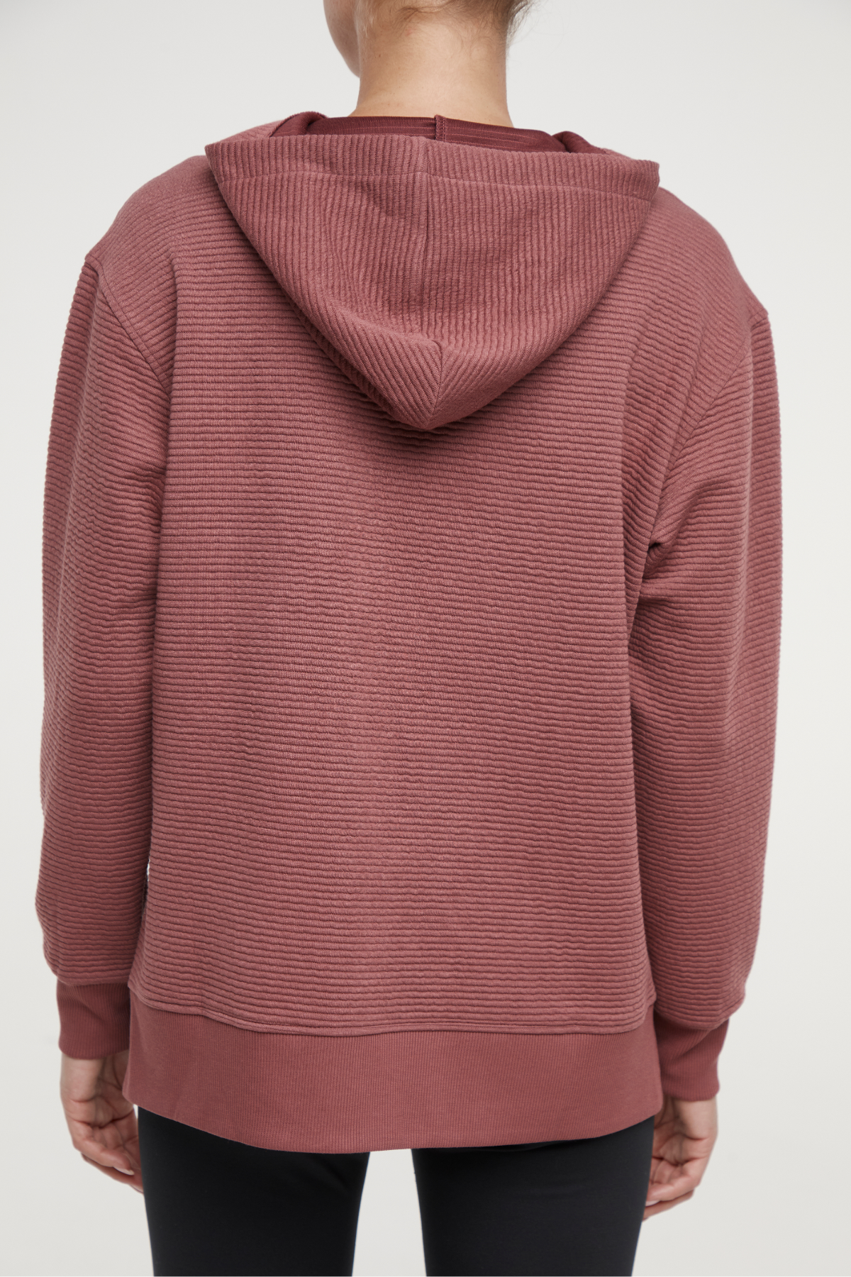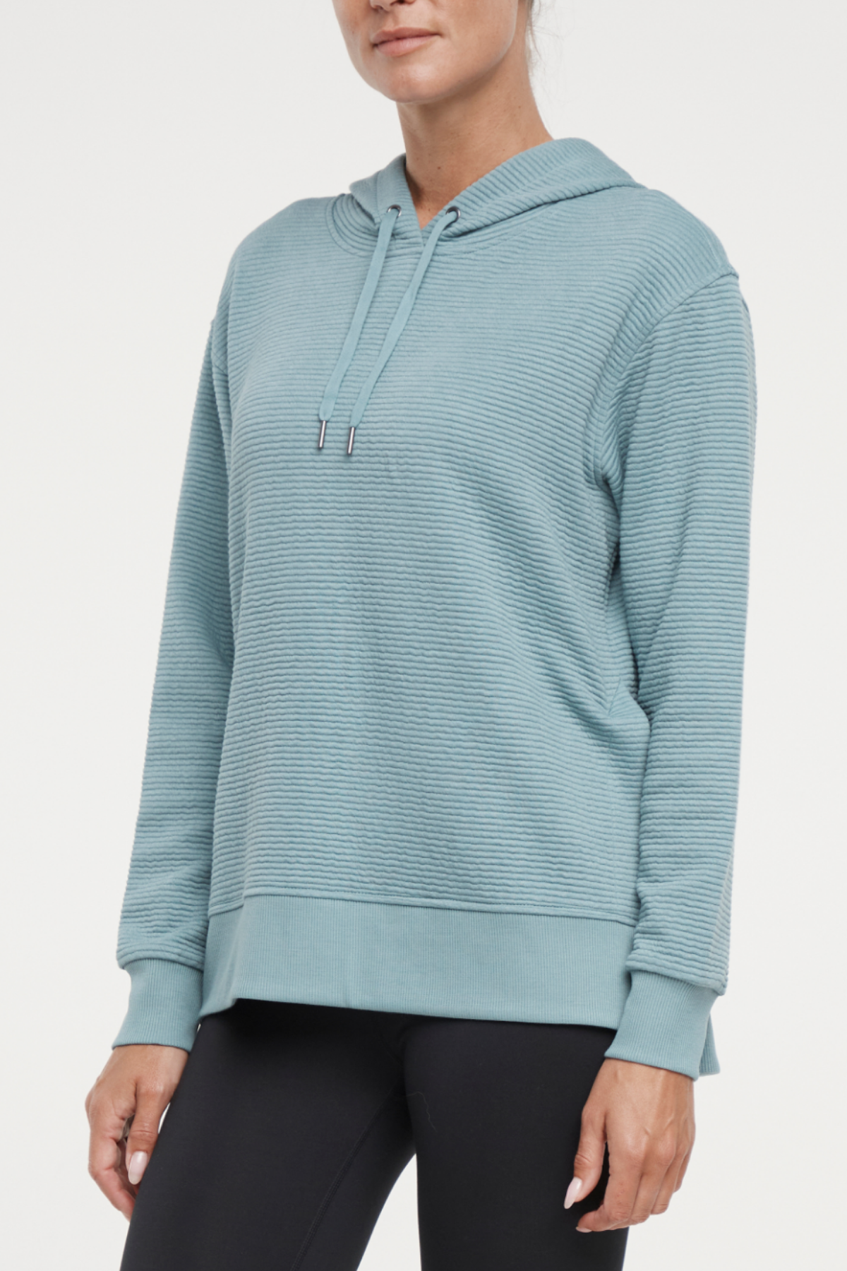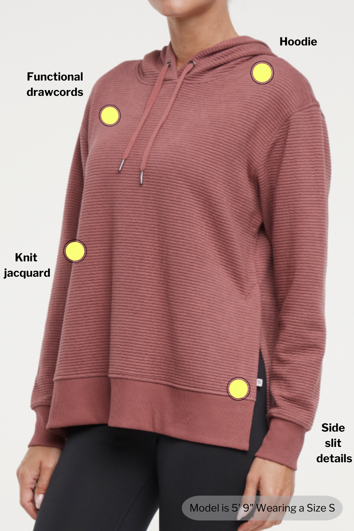 A relaxed fit made for lounge-ready comfort, this knit pullover in soft jacquard features a drawcord hood, cuffed long sleeves, and a banded high-low hem with side slits.