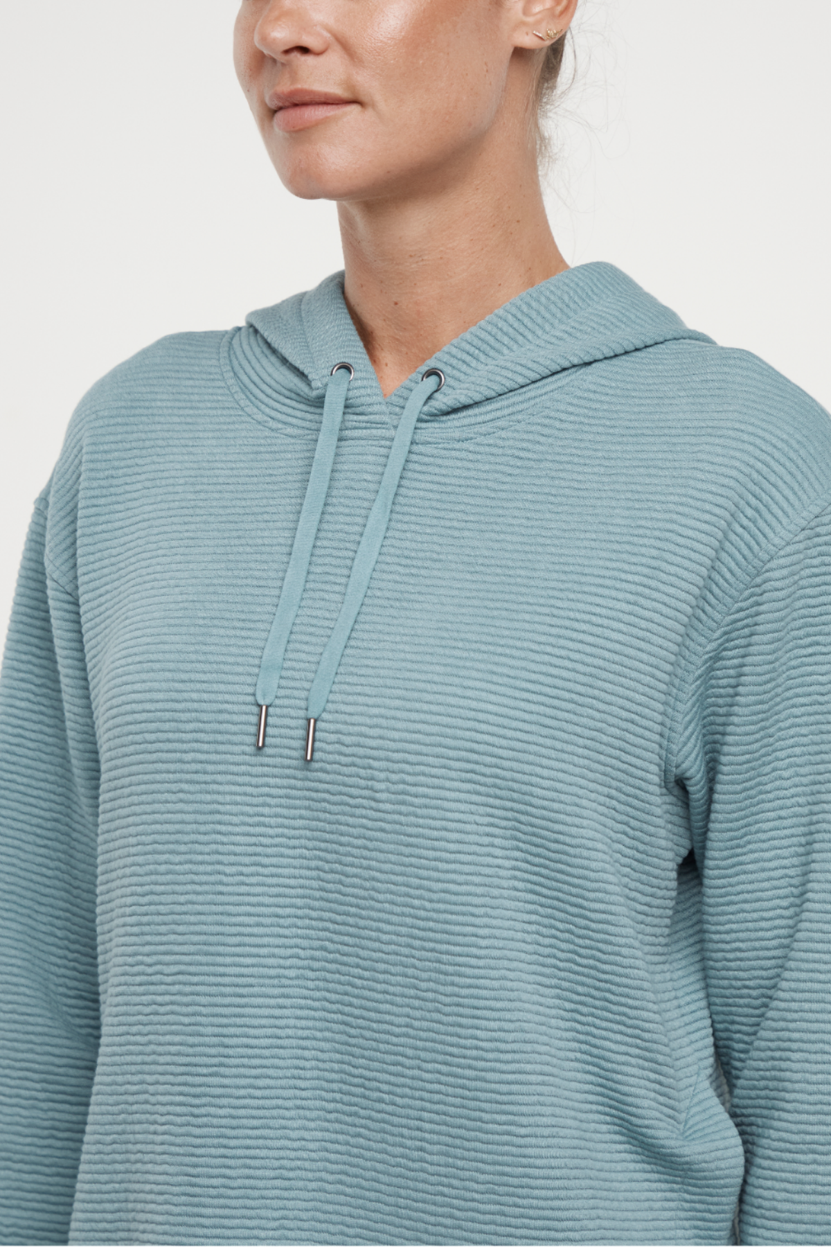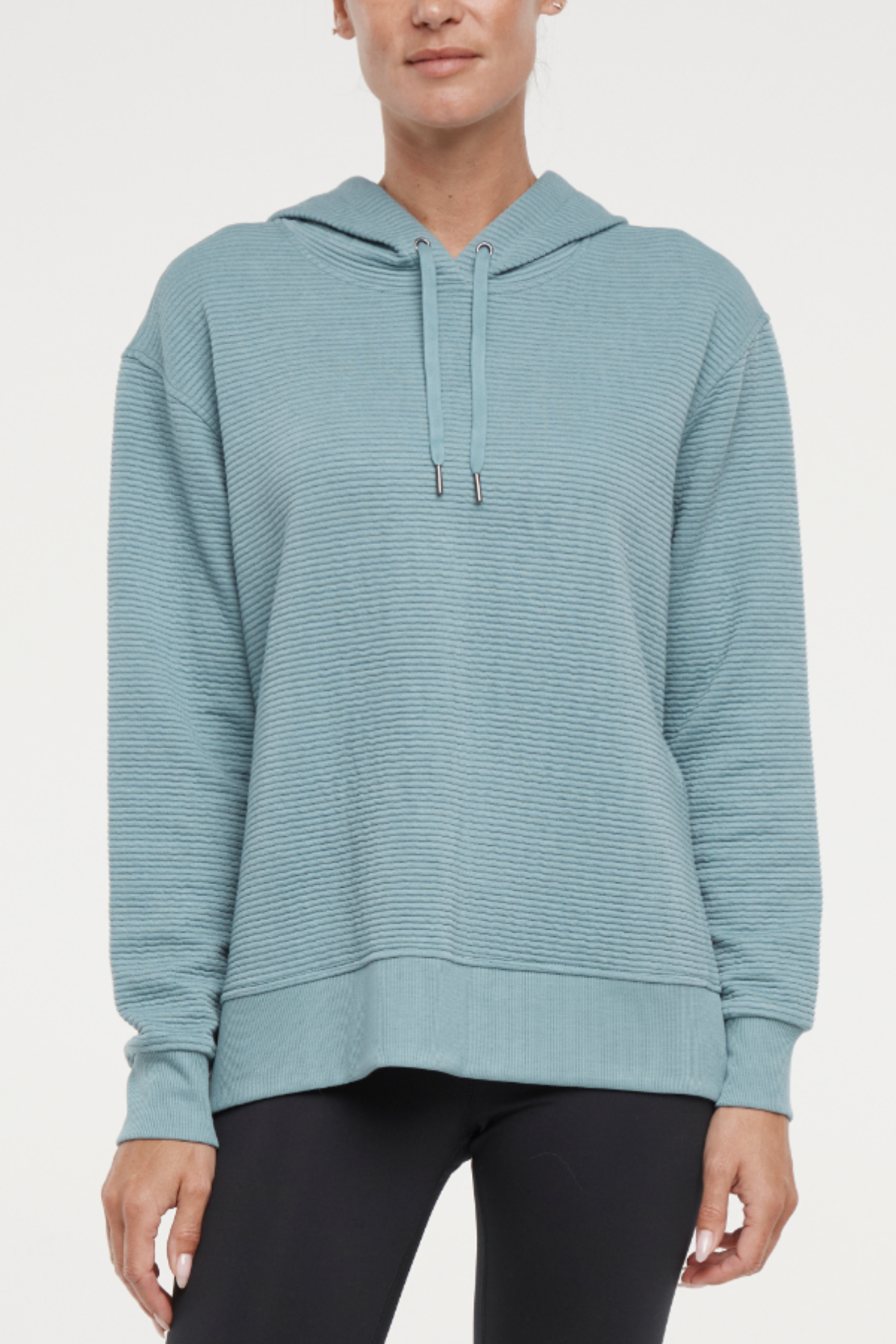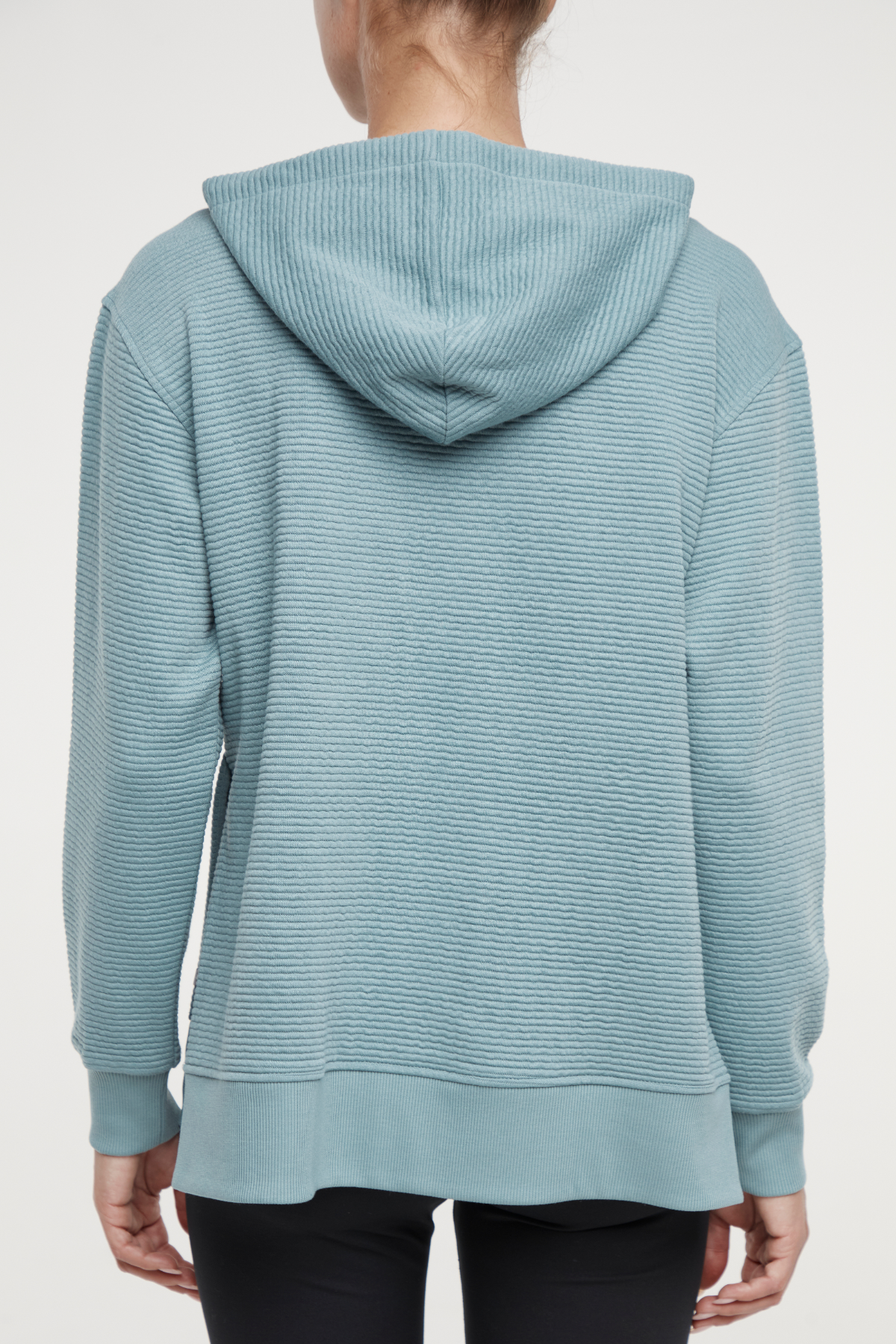 A relaxed fit made for lounge-ready comfort, this knit pullover in soft jacquard features a drawcord hood, cuffed long sleeves, and a banded high-low hem with side slits.